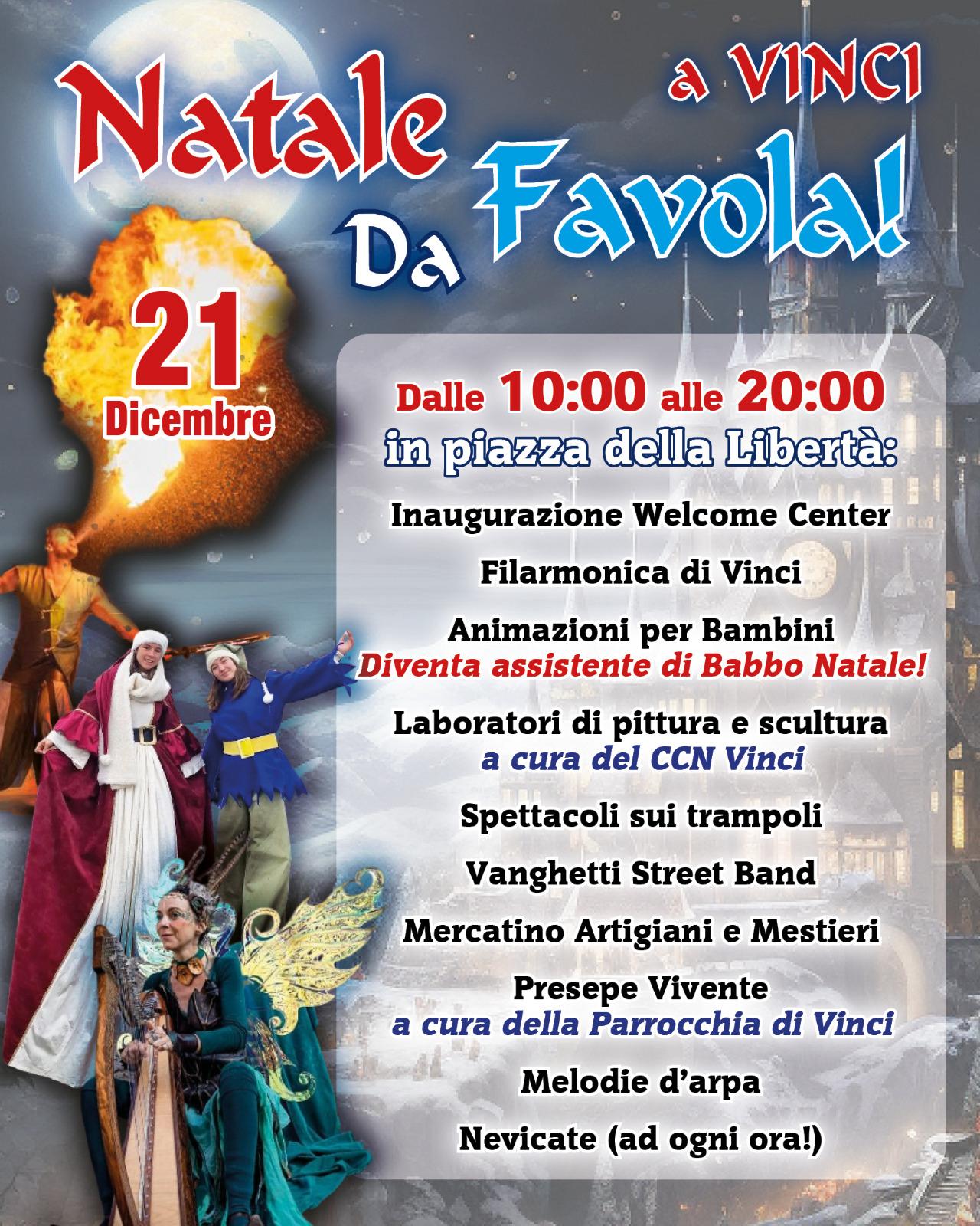 La Festa di Natale animerà le vie di Vinci con spettacoli, animazione itinerante e momenti di intrattenimento pensati per grandi e piccoli.