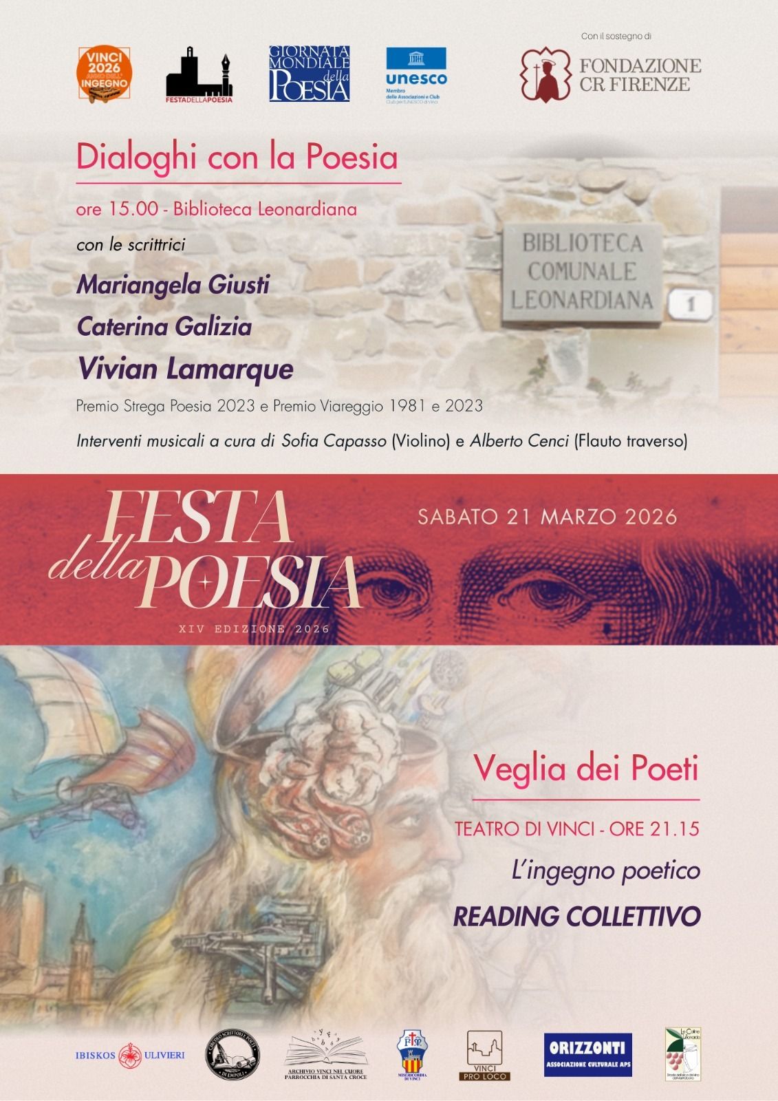 Il 21 marzo 2026, Giornata Mondiale della Poesia, tornano i Dialoghi della Poesia con ospiti di assoluto rilievo. La Biblioteca Leonardiana di Vinci (via La Pira, 1) aprirà le sue porte alle ore 15.00 per un pomeriggio di poesia e musica con tre poetesse e giovani musicisti.